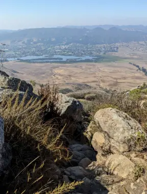 Eucalyptus and cactus forest, then amazing views over the high school toward the morros! After, a difficult, steep, rocky climb with gorgeous views of mountains and distant sea. Also called Bowden Ranch Hike.