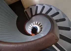 Gorgeous view from the top of a lovely red lighthouse with a rare Fresnel lens on top of a little hill.