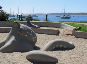 Cement ship playground with logs to climb, seal, dolphin, whale's tail and giant octopus sculptures, picnic tables, and an amazing view of Morro Rock and the inlet.