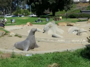 Cement ship playground with logs to climb, seal, dolphin, whale's tail and giant octopus sculptures, picnic tables, and an amazing view of Morro Rock and the inlet.