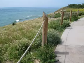 Bluff-top trail full of flowers in the spring. Lovely rugged beach and lagoon below.