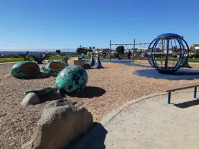 Imaginative playground with dinosaur eggs, huge green lawn, high hills in the distance, and path along the cliffs with views of the ocean and bird rocks!