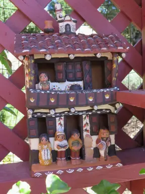 Spanish mission from late 18th century, in downtown San Luis Obispo, with giant roses in the garden behind and a lively plaza in front.