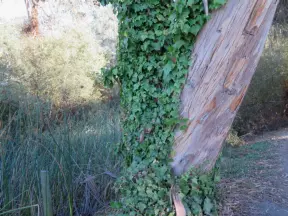Lovely path beside a eucalyptus forest, on both sides of the creek, with workout stations, in a residential neighborhood. You can walk two miles total. Also called San Luis Ranch.