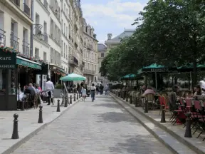 An ancient, pretty street with upscale shops in attractive storefronts. It leads south to the Seine River.