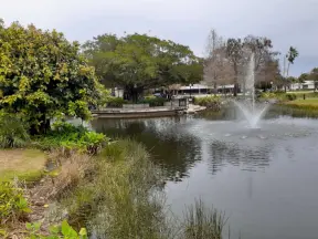 Park with flowering trees, banyan tree, royal palms, memorial arch, and pond with fountain and bridge over it.