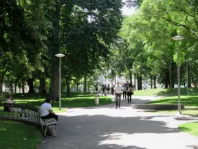 Large square park filled with tall, old trees, looking down on the happy vibes of Dufferin Terrace and the blue river below.