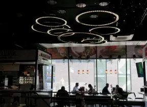 Shopping plaza with a deck offering lots of attractive public space, a trampoline for young kids, a sky deck bar, a dark public market with lights, cafes, stores and coffee shops.