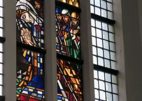 Beautiful, modern cathedral with colorful statues, the twelve stations of the cross, bright stained glass, light-filled rotunda, and amazing organ.