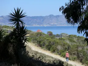 Stretch of grass with a paved walkway, flower beds, wonderful ocean views to Avila Beach, and monterey cypress trees.