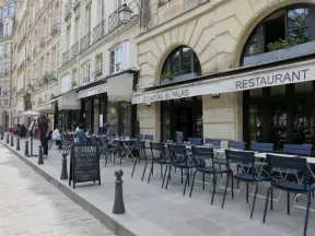 An ancient, pretty street with upscale shops in attractive storefronts. It leads south to the Seine River.