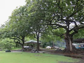 Huge park in Waikiki across from the beach where groups gather to play ball and fly kites.