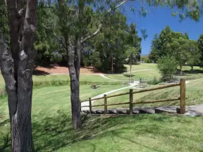 A lovely park of rolling green hills and gnarled oak trees, with a creek, and a new playground with boulders and ropes.