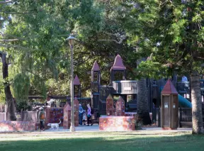 An older playground, tucked at the bottom of a hill, with huge wonderful trees.