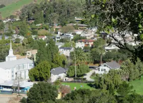 Bike path with views of hills all around, and pretty neighborhood nearby.