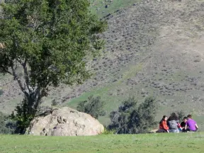 A peaceful 3-mile walk through oaky forest, past lush landscaping and a park with a historic adobe house, and among a neighborhood with gardens filled with flowers.