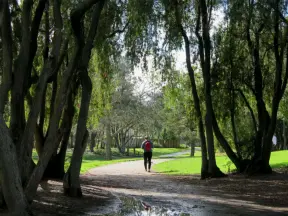 Shady walk among eucalyptus trees. Peaceful! Plus a cute playground tucked in a corner at the end.
