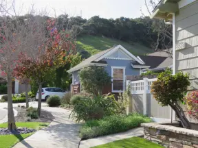 Narrow tree-lined streets in the Anholm District with historic houses and views of Madonna Mountain and Bishop Peak, and a sweet deli.