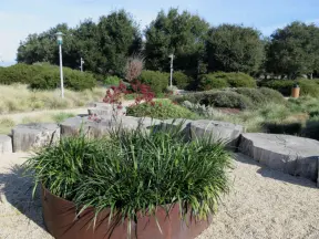 Lovely path beside a eucalyptus forest, on both sides of the creek, with workout stations, in a residential neighborhood. You can walk two miles total. Also called San Luis Ranch.