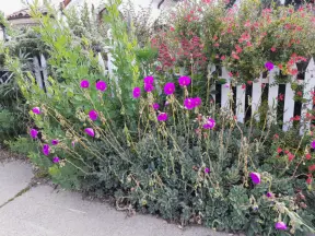 A peaceful 3-mile walk through oaky forest, past lush landscaping and a park with a historic adobe house, and among a neighborhood with gardens filled with flowers.