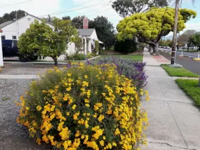 Lovely neighborhood walk past sweet houses and gardens, near fragrant hills with eucalyptus and wildflowers, plus a playground and lawn.