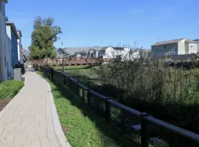 Lovely path beside a eucalyptus forest, on both sides of the creek, with workout stations, in a residential neighborhood. You can walk two miles total. Also called San Luis Ranch.