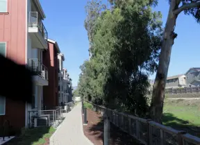 Lovely path beside a eucalyptus forest, on both sides of the creek, with workout stations, in a residential neighborhood. You can walk two miles total. Also called San Luis Ranch.