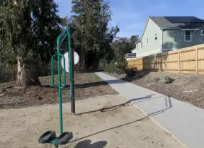 Lovely path beside a eucalyptus forest, on both sides of the creek, with workout stations, in a residential neighborhood. You can walk two miles total. Also called San Luis Ranch.