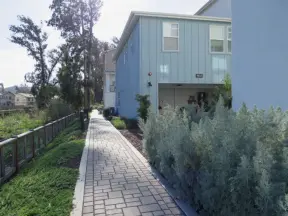 Lovely path beside a eucalyptus forest, on both sides of the creek, with workout stations, in a residential neighborhood. You can walk two miles total. Also called San Luis Ranch.