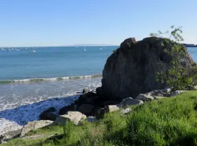 A long stretch of beach where dogs run off leash. Also nice for parking your car above the beach, to watch the ocean in the rain.