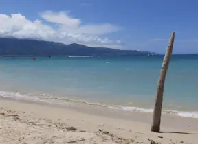 A curved beach of stunning blue-green water, lined with palm trees on one end, backed by ironwood forest, with piles of coral on the white sand, and kite surfers and mountains in the distance.