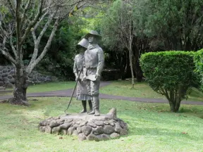 Beautiful statue backed by trees, with fruit and flower offerings below it. Huge lawn, narrow paths, picnic tables, and pedestrian bridge to Wailoa River State Park.