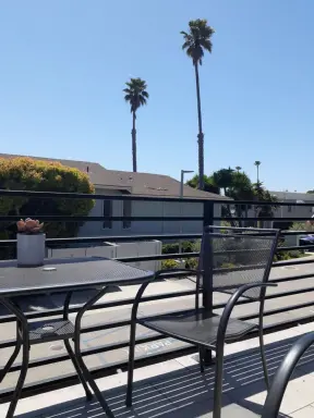 Cute area on Grand Avenue with colorful sidewalk, palm trees, ocean air, and a few good cafes.