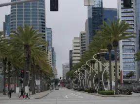 Wide, 3-mile-long walkway on the waterfront with blue lampposts, canary palms, lawns, modern sculptures, and views of the Bay Bridge. Find ferries, restaurants, touristy shops, and museums.