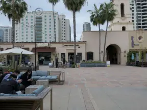 Gorgeous outdoor mall near UC San Diego, with lots of public spaces, cafes, and even a huge outdoor climby for kids.