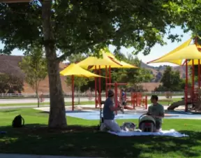 Large playground for big and little kids, with shade canopy, redwood trees, and walkway around the park.