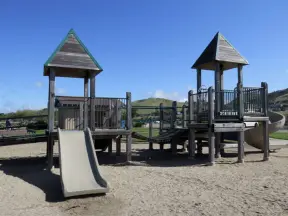 Imaginative playground with dinosaur eggs, huge green lawn, high hills in the distance, and path along the cliffs with views of the ocean and bird rocks!