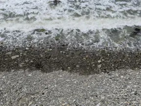 Beautiful beach with big pebbles at the shore, and mansions almost right up to the water.