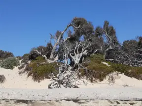 Rugged, windswept beach with large driftwood, kelp balls, and 1.5km wooden boardwalk.