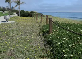 Stretch of grass with a paved walkway, flower beds, wonderful ocean views to Avila Beach, and monterey cypress trees.