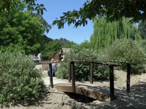 Lovely path beside a eucalyptus forest, on both sides of the creek, with workout stations, in a residential neighborhood.