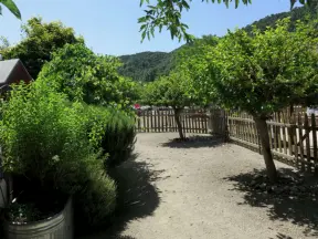 Wide partially shady path that leads through oak forest, past a market, and a Secret Garden with live music, to Avila Beach.