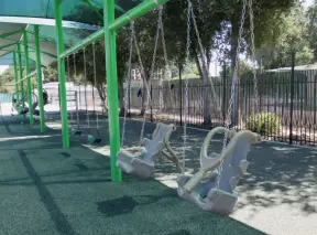 Park with plenty of benches in the shade, accessible playground with unusual equipment, tire swing, dome climby, wooden truck, dinosaur and dolphin bouncy, and plenty of swings.