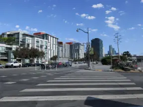 Modern area, also called Mission Bay, with French bakery, waterfront bike path that connects to Embarcadero, and views across to Oracle Park stadium and the Bay Bridge.