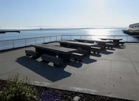 Cement ship playground with logs to climb, seal, dolphin, whale's tail and giant octopus sculptures, picnic tables, and an amazing view of Morro Rock and the inlet.