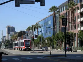 Wide, 3-mile-long walkway on the waterfront with blue lampposts, canary palms, lawns, modern sculptures, and views of the Bay Bridge. Find ferries, restaurants, touristy shops, and museums.