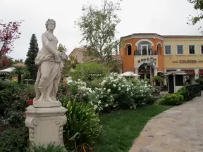 A shopping plaza with sidewalks cafes and shops that would look like Europe if it weren't so new!