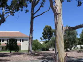 Beautiful campus with white buildings, rainbow eucalyptus trees, and views of the mountains and hills.