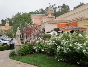 Restaurants with magical gardens, shops, fountain, open grassy areas, historical salmon-pink Spanish Revival architecture at a former naval training center.