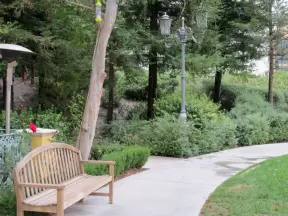 Wide partially shady path that leads through oak forest, past a market, and a Secret Garden with live music, to Avila Beach.